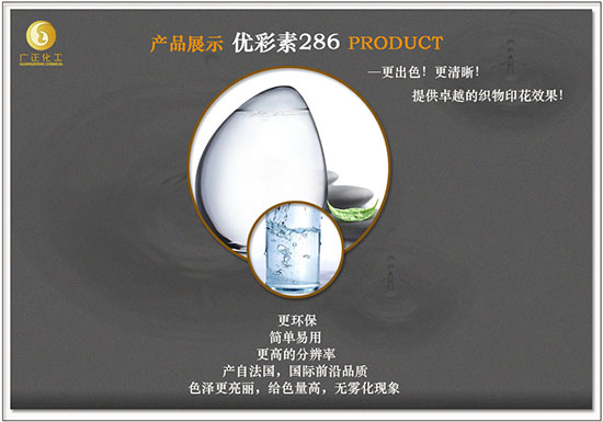 現(xian)在,以上問題都(dou)可以有一個解(jie)決方案了,因爲(wei)終于有了一個(ge)可以令紡織産(chǎn)品顔色 更鮮豔(yan)、輪廓更清晰的(de)數碼印花助劑(ji)—數碼印花增(zēng)色劑 (優彩素286) ,它(tā)源于國際前沿(yan)法國,是一隻高(gao)清數碼印花增(zeng)色劑,不但令色(sè)澤更亮麗,設計(jì)分辨率更高,而(er)且回潮率穩定(ding),漿後布面不發(fa)硬,便于數碼打(dǎ)印,更令人驚🚶♀️喜(xǐ)是操✨作極其方(fang)便,即開即用,無(wu)需放置,減少浪(lang)費,成本極低。當(dāng)然,它一定是環(huán)保産品,絕對不(bu)含?APEO。如欲🌂咨詢,廣(guǎng)正化工願意詳(xiáng)細跟您解說,有(yǒu)興趣可緻電4008696388